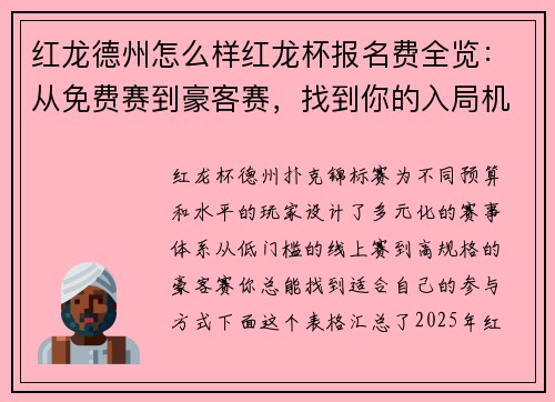 关于“Red Dragon Poker King”的奖金或补偿信息,我没有在当前的搜索结果中找到与之直接相关的具体说明。 我为你整理了搜索结果中提到的另一项相关赛事——2025年红龙扑克巡回赛(Red Dragon Poker Tour) 的一些奖金信息,希望能帮助你对该系列的赛事规模有一个大致的了解。 2025年红龙扑克巡回赛奖金参考 以下是该巡回赛在不同时间和地点举办赛事时公布的奖金情况: ...